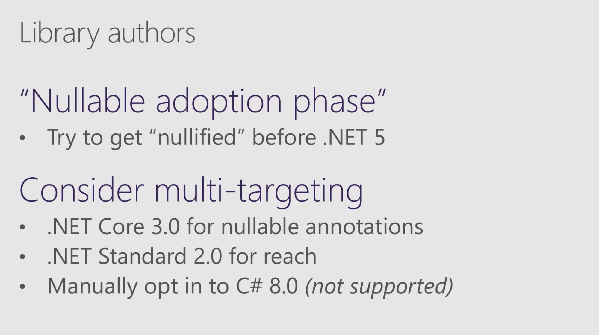 Here is a slide a from by Mads Torgersen at .NET Conf, saying that for library authors you want to consider targeting both netcoreapp3.0 and netstandard2.0, and use C# 8.0 to get “nullified” during this “Nullable adoption phase”. You can catch the full video here.